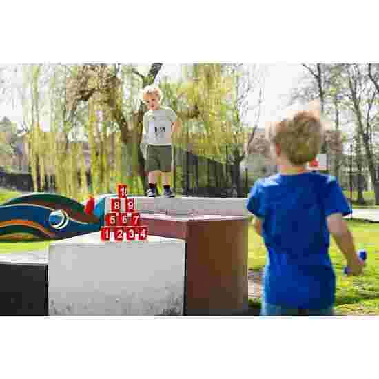 The throwing game consists of ten red, numbered cans and three colourful throwing bags. With this game children can practise their aim and knock down the cans with small bags. Simply stack the metal cans and the game can begin. Whether arranged as a pyramid or set up in a row, the possibilities are endless. Alone or in a team – who can knock down all the cans with the bag?