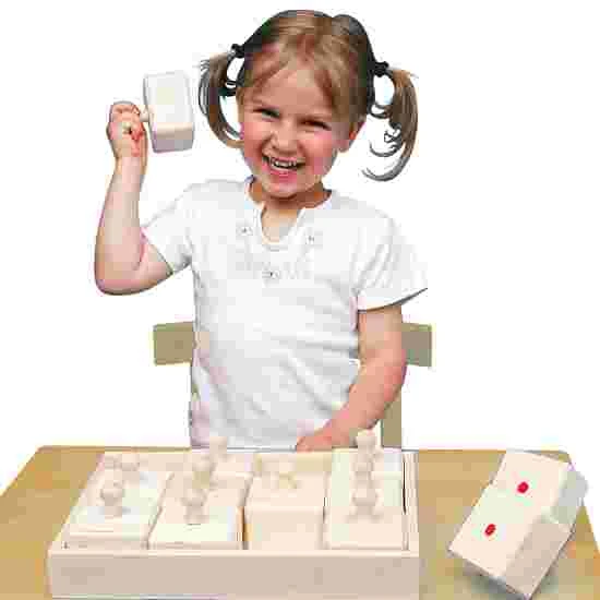 Consisting of 12 wooden boxes containing 6 different types of material. The player must guess by shaking them, which pairs belong together. The coloured markings underneath show if the guess was correct or not. Very good for training hearing skills and perception. 32 x24 cm.