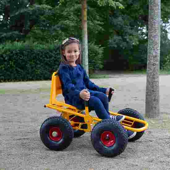 With the “Moon Car”, a journey over the playground turns into a safari – or an exciting trip on the surface of the moon. Deep-tread, puncture-proof tyres travel over hills, sand pits and slopes. Sand, grass, gravel or mud – no problem for this children’s vehicle. Where traditional go-carts give up, the “Moon Car” really goes for it. Besides the off-road tyres, a robust, powder-coated steel frame and smooth-running industrial ball bearings on the pedals make the “Moon Car” great for off-road use. To ensure the driver can sit securely in the seat over rough terrain, the seat has a backrest and small side rests. The rear-wheel steering, which is operated using the handlebars, is very versatile and exciting for children to use.