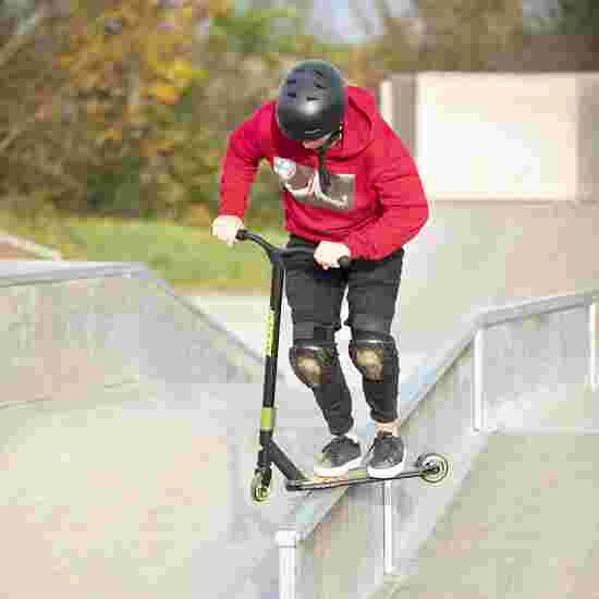 The Schildkröt Fun Wheels “Kickless” stunt scooter comes with a non-slip grip tape deck featuring a cool design. The deck’s underside is slightly bevelled providing it with ‘grind’ edges. The 54-cm-wide and 84-cm-tall reinforced Y-shaped handlebars are made of premium-quality aluminium. And, of course, they can be rotated 360 degrees, so that you can perform all tricks and stunts. The Schildkröt “Kickless” scooter’s rear wheel has been fitted with a robust brake made of abrasion-resistant steel, ensuring the scooter can be quickly and safely brought to a halt.