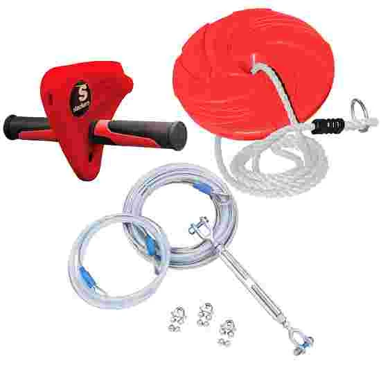 The set includes a comfortable seat attached to a rope which is height-adjustable. The wheeled metal pulley is housed in a plastic case. The rubberised handles allow the user to firmly hold on during their ride.